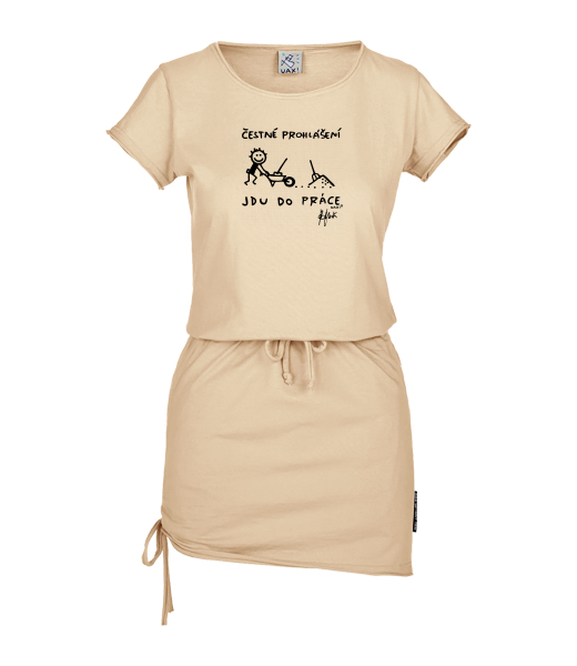 Women's dress URBAN with original prints for woman with design 1304 ČESTNÉ PROHLÁŠENÍ JDU DO PRÁCE in color CARAMEL