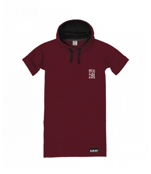 LADIES SWEATSHIRT DRESS SHORT made of thin breathable tracksuit made of elastic material. Sweatshirt dress with short folded sleeves, over the head with a hood. The hood is stitched with an inner black knit insert. The dress has black laces and spacious pockets on the front. We also sew in oversized sizes 3XL and 4XL. In addition, ladies will appreciate the larger opening over the head, thanks to which the dress can be changed comfortably and will not spoil the hairstyle or make-up.