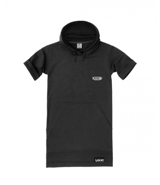 LADIES SWEATSHIRT DRESS SHORT made of thin breathable tracksuit made of elastic material. Sweatshirt dress with short folded sleeves, over the head with a hood. The hood is stitched with an inner black knit insert. The dress has black laces and spacious pockets on the front. We also sew in oversized sizes 3XL and 4XL. In addition, ladies will appreciate the larger opening over the head, thanks to which the dress can be changed comfortably and will not spoil the hairstyle or make-up.