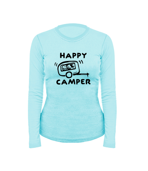 Women's cotton shirt with long sleeves for woman with design 1116 HAPPY CAMPER in color PASTEL BLUE