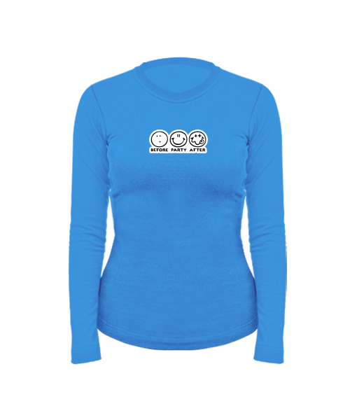 Women's cotton shirt with long sleeves for woman with design 1120 BEFORE PARTY AFTER in color CAPRI BLUE
