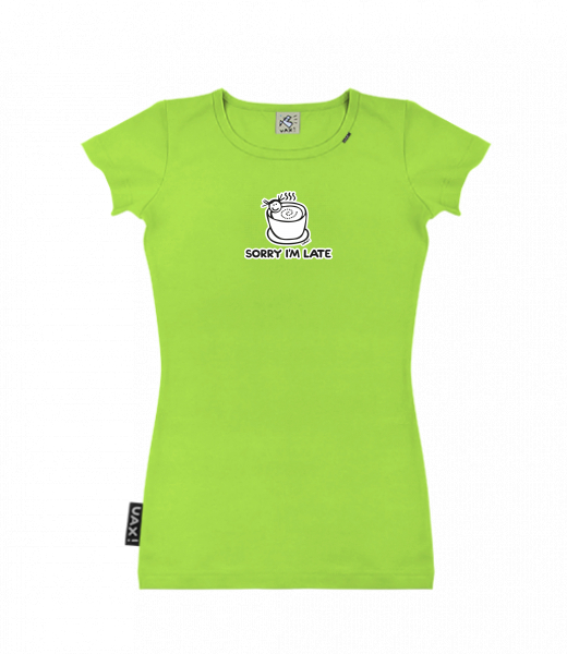 Dámské tričko s potiskem SKRATDA UAX! for woman with design 1087 SORRY IM LATE in color PARROT GREEN
