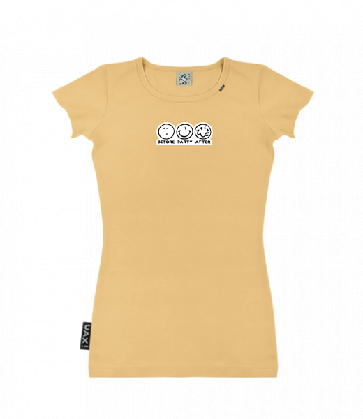 Dámské tričko s potiskem SKRATDA UAX! for woman with design 1120 BEFORE PARTY AFTER in color MUSTARD