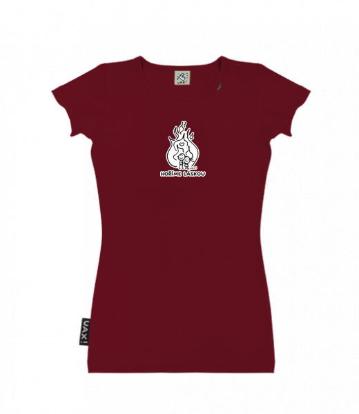 Dámské tričko s potiskem SKRATDA UAX! for woman with design 1208 HOŘÍME LÁSKOU in color DARK RED