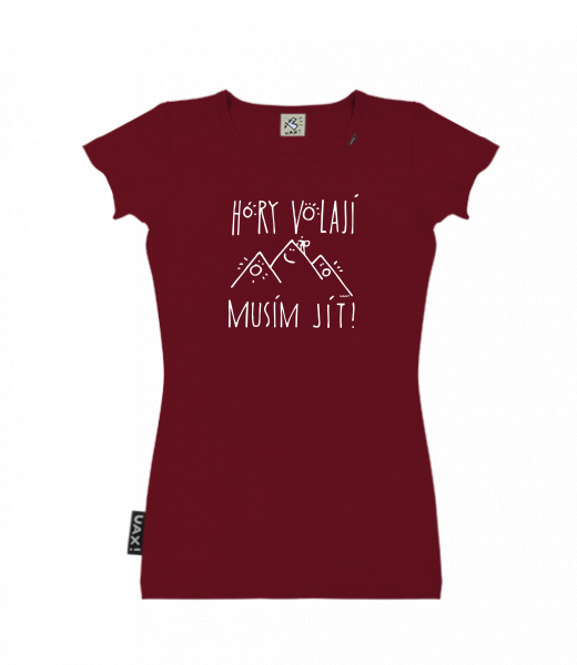 Dámské tričko s potiskem SKRATDA UAX! for woman with design 1233 HORY VOLAJÍ MUSÍM JÍT in color DARK RED