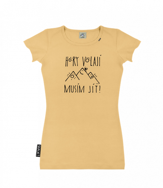 Dámské tričko s potiskem SKRATDA UAX! for woman with design 1233 HORY VOLAJÍ MUSÍM JÍT in color MUSTARD