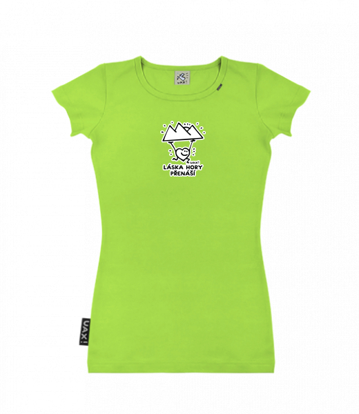Dámské tričko s potiskem SKRATDA UAX! for woman with design 1264 LÁSKA HORY PŘENÁŠÍ in color PARROT GREEN
