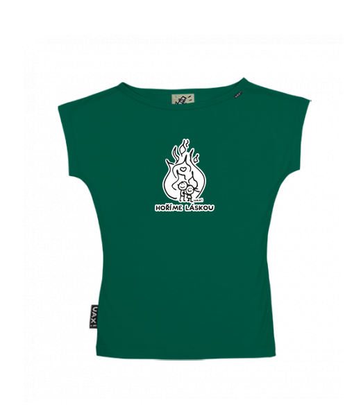 WOMEN'S BOAT NECK T-SHIRT for woman with design 1208 HOŘÍME LÁSKOU in color UNIVERSITY GREEN