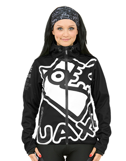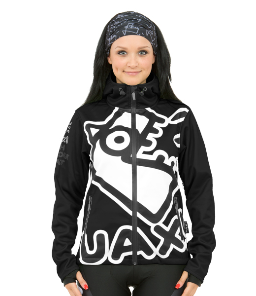 The original women's softshell jacket with hood and print UAX! Fish from water and wind resistant material. Waterproof zippers, underarm ventilation and elastic gloves with thumb hole.