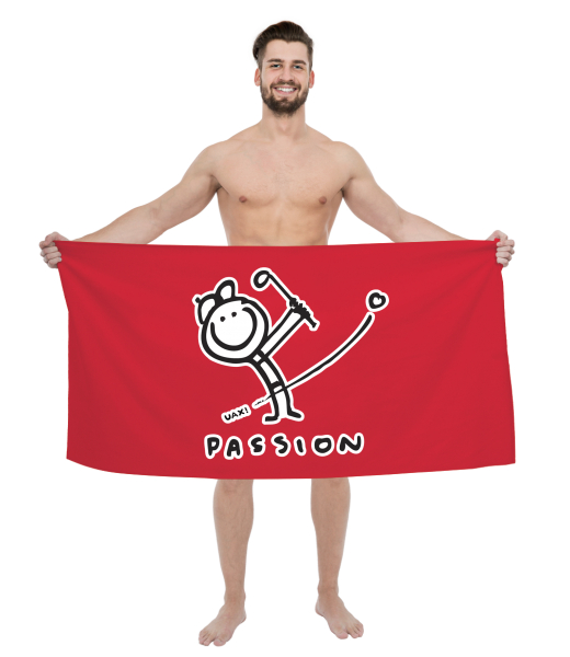 The original towel imprinted with UAX! Golf collection for woman with design 1052 PASSION in color RED