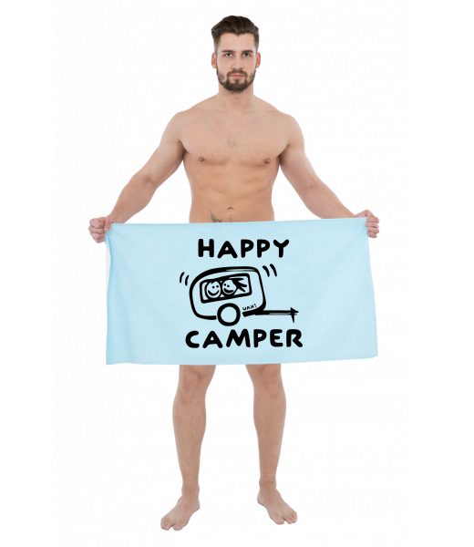 The original towel imprinted with UAX! Golf collection for woman with design 1116 HAPPY CAMPER in color PASTEL BLUE