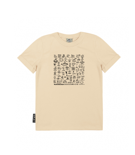 T-shirt cut and processing: Classic straight loose cut of the t-shirt (not oversize). The neckline is sewn with elastic ribbed trim. Double seams at the neck, on the sleeves and bottom hem. Bent sleeves. The t-shirt has a woven UAX label sewn into the side seam.